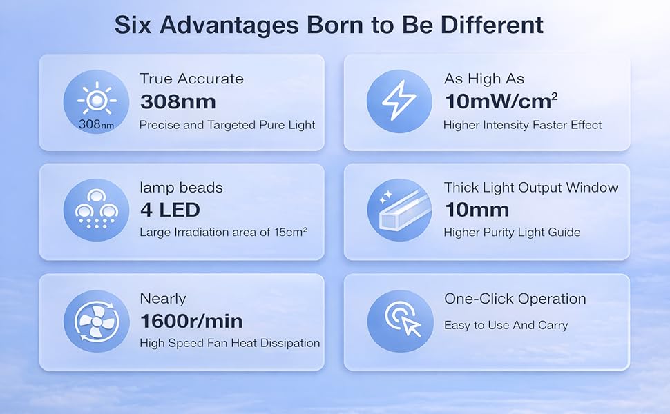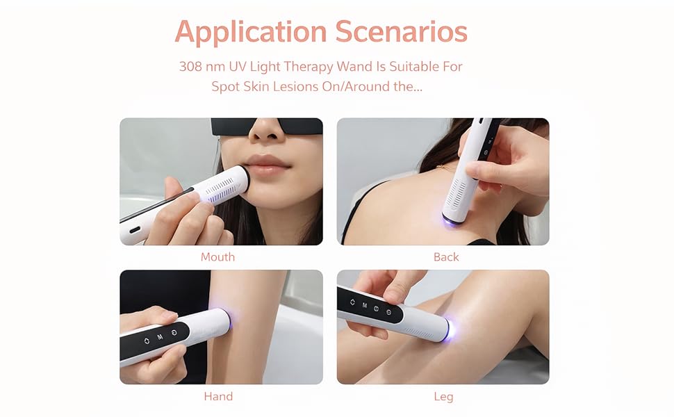 • Targeted UVB Phototherapy for Skin Conditions - Clinically inspired 308nm UVB light therapy designed to support treatment of vitiligo, psoriasis, and eczema. Delivers focused light exposure to affected areas for effective skin care.