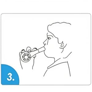 - Choose a sitting position, lean back on a chair, relax your shoulder, hold the breathing trainer horizontally, and cover your mouthpiece.